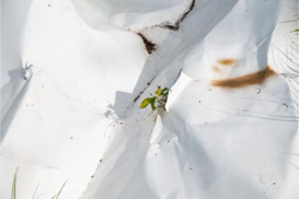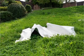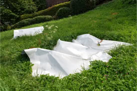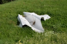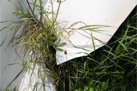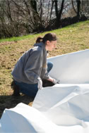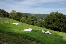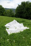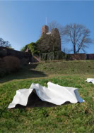 In der Arbeit verwehte Zeit werden drei Objekte auf der Wiese zum Liegen kommen, die wie zufällig hin geweht erscheinen – sei es aus Unachtsamkeit weggeworfenes Papier oder durch den Wind den Händen entrissene Unterlagen. Verblasste Spuren sind zu erkennen, sind Teil einer vergangenen Zeit, die Momente oder Gedanken hinterlassen und uns Rätsel aufgeben.
