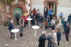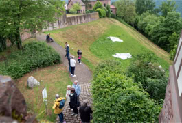 Der Startschuss zur diesjährigen Radiale fiel am 4. Mai mit der ersten Vernissage im Kommandantenhaus Dilsberg und dessen Außengelände mit der künstlerischen „Intervention“ Kunst am Grünen Hang. Im Innenbereich des Kommandantenhauses sowie im Atelier haben fünf Künstlerinnen und Künstler Ihre Werke präsentiert. Eine bunte Mischung aus installativen Arbeiten, Malerei, Zeichnung, aber auch Arbeiten aus Keramik und Fotografie boten den Besucherinnen und Besuchern eine abwechslungsreiche und sehenswerte Ausstellung. So präsentierte Paul Schuseil Keramikobjekte, Alexander Horns Bilder zeigten abstrakte Formen, Daniel Schoas Zeichnungen und Porträts fanden ihren Platz auf ungewöhnlichen Bildträgern wie Milchtüten und Teebeuteln, Fatma Biber-Born widmete ihre Serie Kofferkind den Schicksalen zurückgelassener Kinder während der Gastarbeiterdekaden der 1960er, 70er und 80er Jahre und Elisabeth Kamps überzeugte mit einer Rauminstallation im Spannungsfeld zwischen wissenschaftlicher Dokumentation und poetisch bildnerischer Gestaltung. Neben der Kunst war auch die musikalische Umrahmung mit dem jungen Pianisten Timo Zheng von der Musikschule Neckargemünd ein kleines Highlight der ersten Vernissage.
