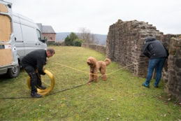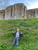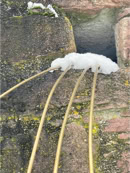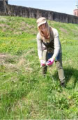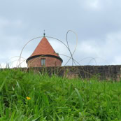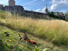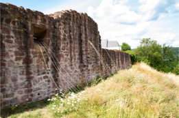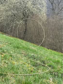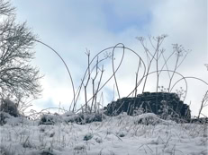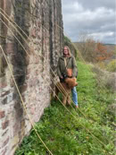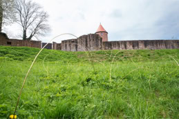 Mit der Ihrer Arbeit bezog sich die Künstlerin auf eine Sage. Diese besagt, dass sich einst Bauern auf dem Dilsberg einem militärischen Angriff erwehren konnten, indem sie von der Stadtmauer Bienenkörbe ausschütteten und die wild gewordenen Bienen die Angreifer erfolgreich in die Flucht schlugen. »Der Leitgedanke für meine plastische Arbeit«, so die Künstlerin, »ist also der Moment der Abwehr, von (feindlichen) Angriffen, dieses gemeinsame Ausschwärmen, raus aus den Bienenkörben und das in großer Anzahl.« Aus drei Öffnungen der Stadtmauer treten dicht gebündelte, aus Messingdraht bestehende Linien hervor. In leichten Schwüngen ergießen sich die Linienströme über eine Länge von über dreißig Metern über den Abhang. Eingewoben in die Gräser simulieren die matt glänzenden, honigfarbigen Messingdrähte in welligen Auf- und Abbewegungen die Fluglinien des gereizten und zum Angriff übergehenden Bienenschwarms. In einer reduzierten, geradezu minimalistisch anmutenden Bildsprache formieren sich die honigfarbigen, matt glänzenden Drähte zu einer flutenden, rhythmisch gegliederten Gesamtbewegung.